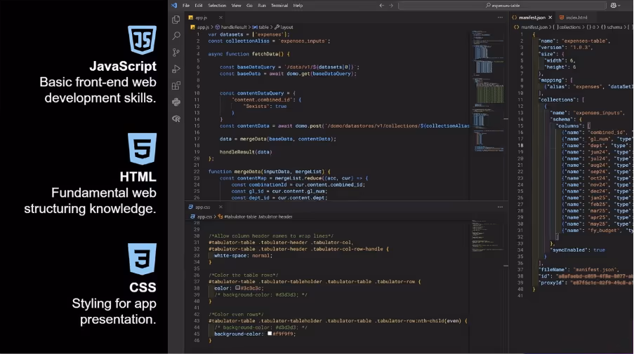 Custom apps in Domo are built using external software. You or the web developer will also need to be proficient in three key languages: