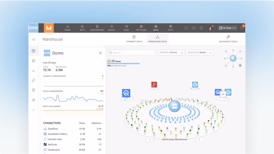 Domo's platform handles the heavy lifting for real-time AI workloads with easy ingestion, automated dataflows, and built-in governance. It lets you zero in on what matters, delivering business value through pipelines that are rock-solid, traceable, and ready for enterprise scale.