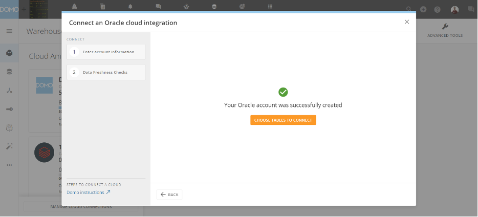 - 次の手順で、DomoがOracle環境に変更を加えられることを理解していることを確認し、[次へ]を選択します。 書き込み統合が正常に設定されたことを確認するメッセージが表示されます。