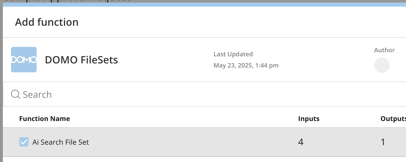 [AI検索FileSet] メソッドのチェックボックスをオンにして、 [関数を追加] を選択します。