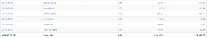 サブヘッダーのフォントの色 | Mega表のサブヘッダー行のテキストの色を選択できます(これを有効にするには、 [小計行]、[サブヘッダー行を表示] チェックボックスを使用して、サブヘッダー行をオンにする必要があります)。デフォルトでは、色は黒です。 例では、サブヘッダー行が赤のテキストで表示されています。 | |