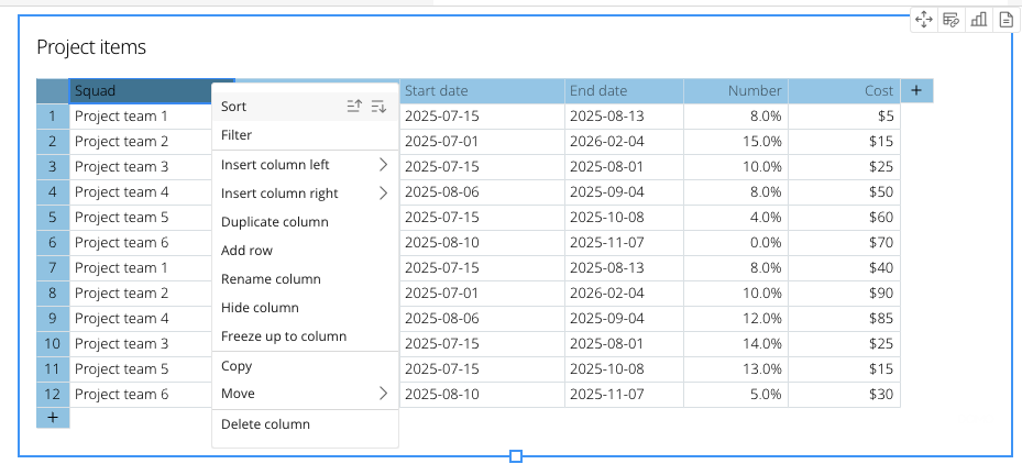 App Studioキャンバスで表コンポーネントを使用できるようになりました。 表コンポーネントを使用すると、ワークフローの計画とトラッキング、 CSVファイルのアップロード、カスタム列の追加、既存のデータへの接続のために表をゼロから作成できます。