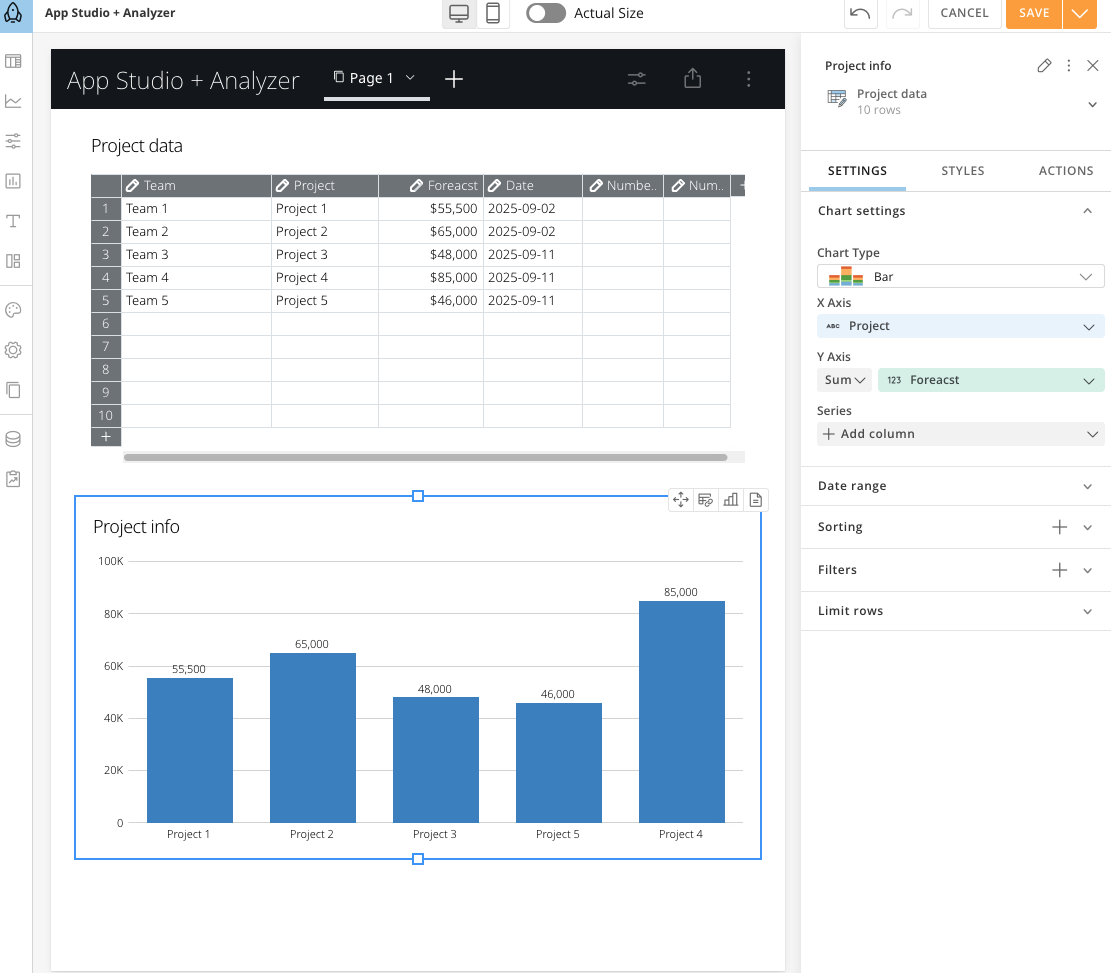 App Studioを使用すると、データを使用してグラフや表をいくつかのステップで自動的に生成できます。初期設定は必要ありません。 次のツールとオプションを使用して、必要なものを作成します。- 列を選択し、計算を追加し、日付範囲を調整し、フィルターを適用します。