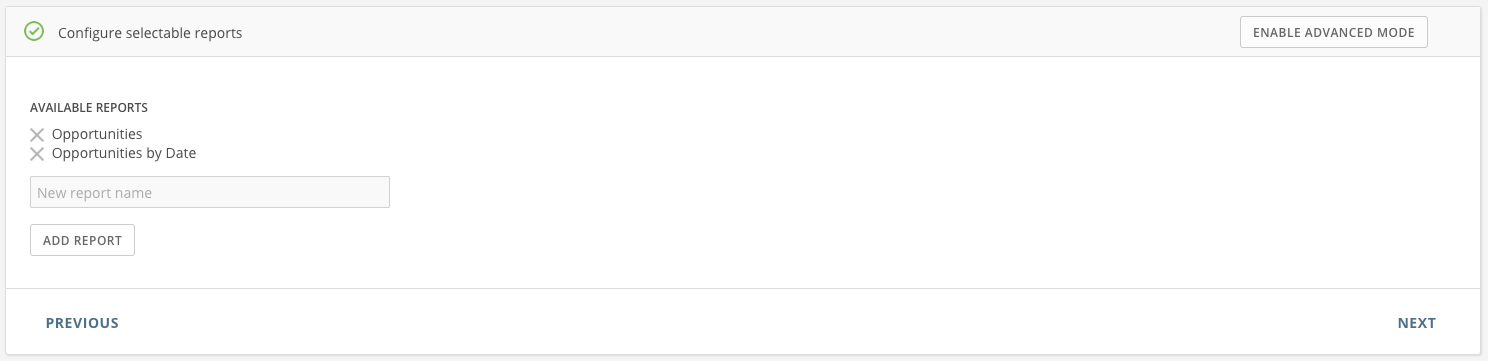 When your connector is published, the report that the user selects will be stored in the metadata JavaScript object using the same capitalization and spaces you use to define it here. You will use the report name in the next step, when you define how the data is processed.