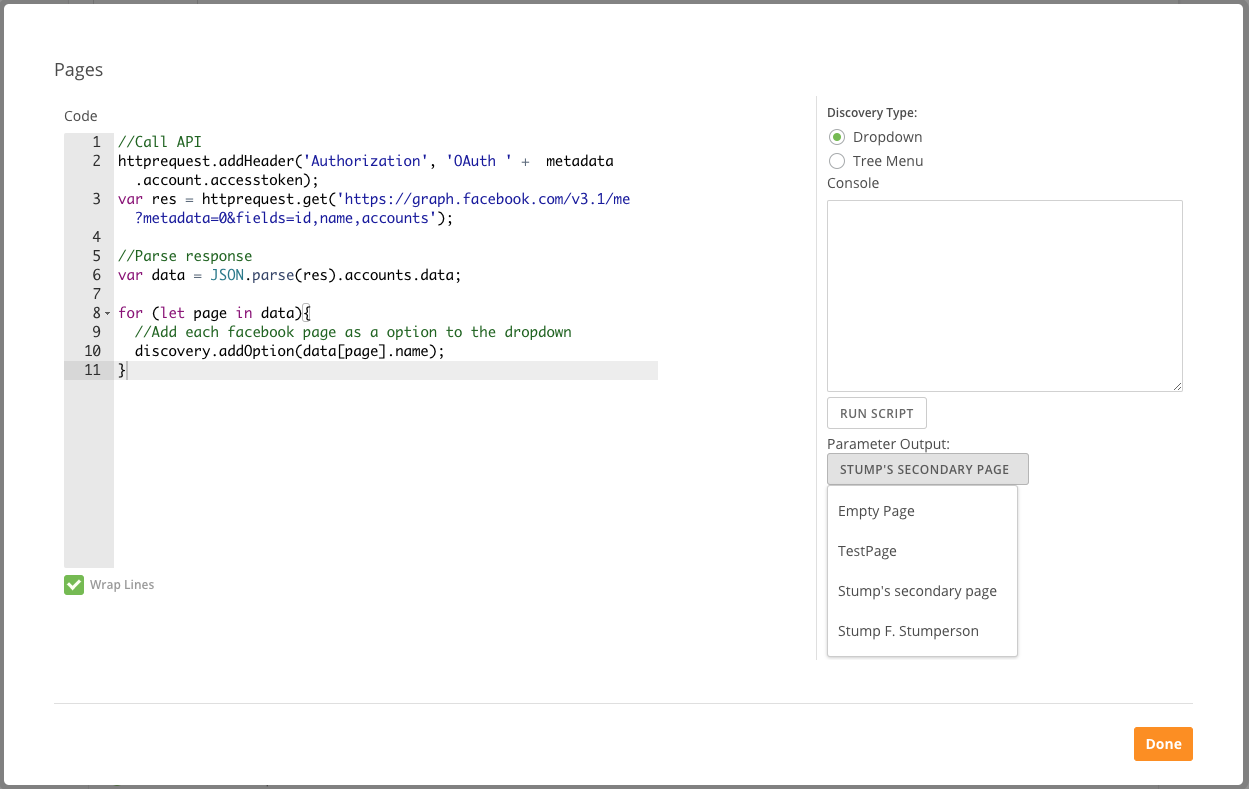 This example makes a call to the Facebook API to get all the pages controlled by this user. It inserts them as options into a discovery dropdown. This will allow a user to select just one Facebook page to run a report on. Click Run Script to see Parameter Output.