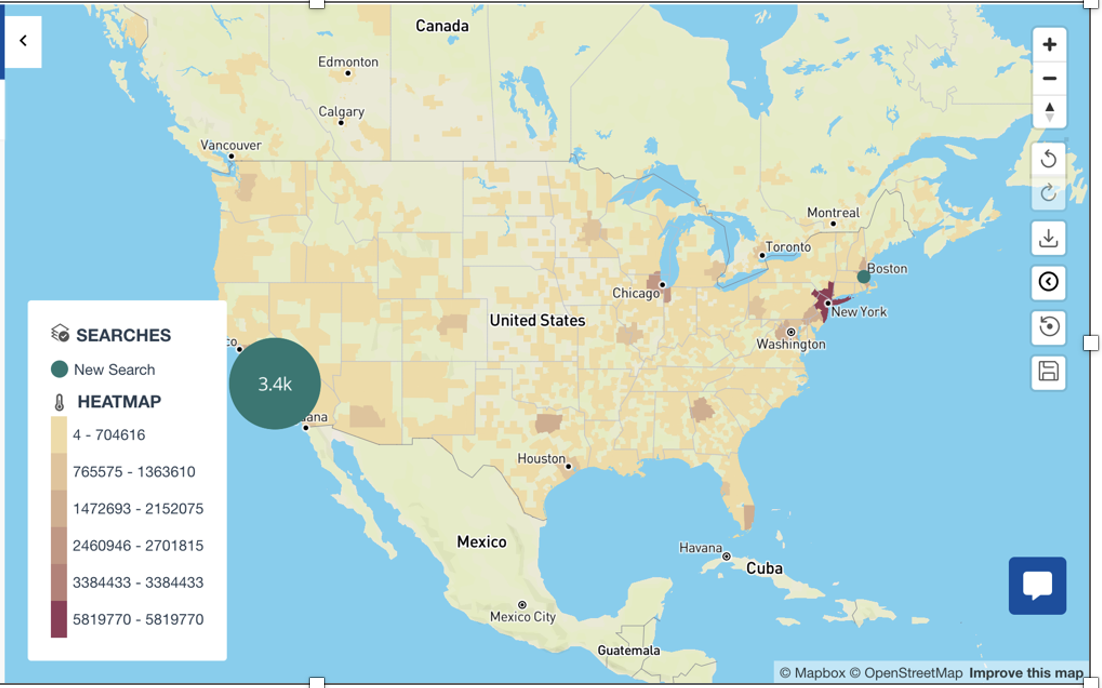 After you create searches, Map Layers, and Heatmaps, you can interact with these items on the map. Searches display as colored dots on the map called Pins. If a Pin represents an individual location, it is a small dot without a number in the middle. If it represents a cluster of locations, the dot is larger and has a number in the middle representing the number of grouped locations.