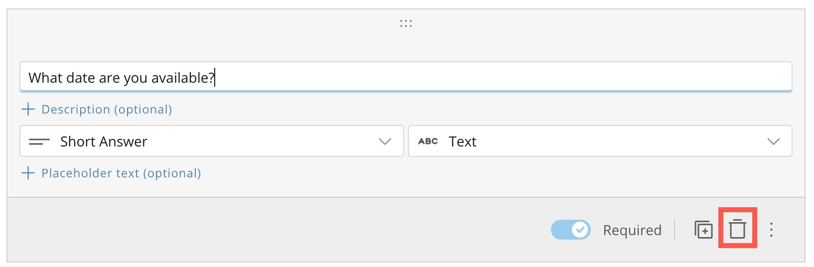 Required questions: The Required toggle allows you to make a question required for form users. By default, all questions are required. If a question is marked required, form users must enter a value before submitting the form.