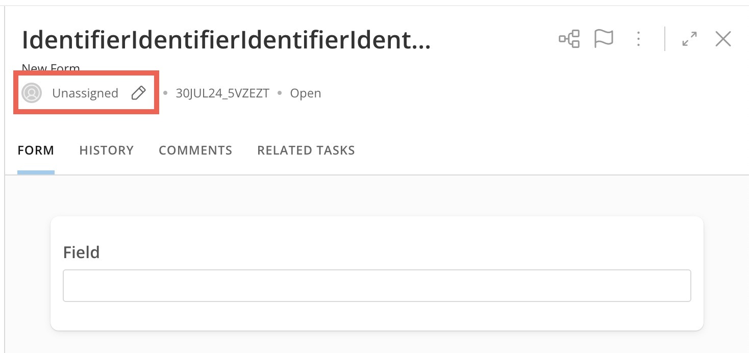 You can assign a task to a user by selecting Edit (pencil icon) in the Assignee field in the form viewer header.