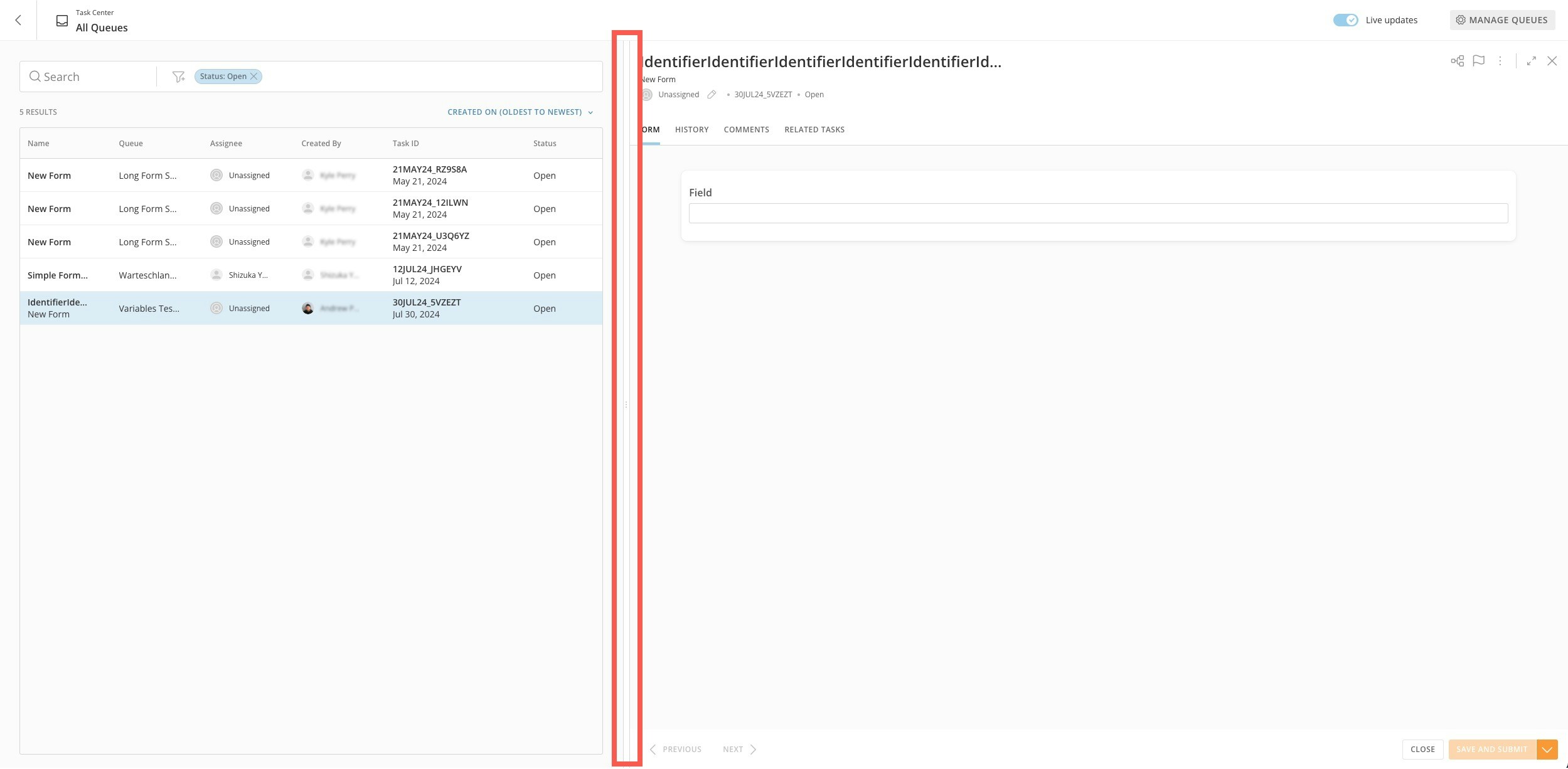Note: You can use the slider between the task list and form viewer to resize the width of either section. There is also an Expand option to make the form viewer full screen.