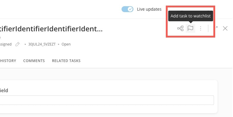 To add a task to the watchlist, navigate to the task list and select the task you want to add. In the form viewer header, select Add task to watchlist. The flag icon turns orange.