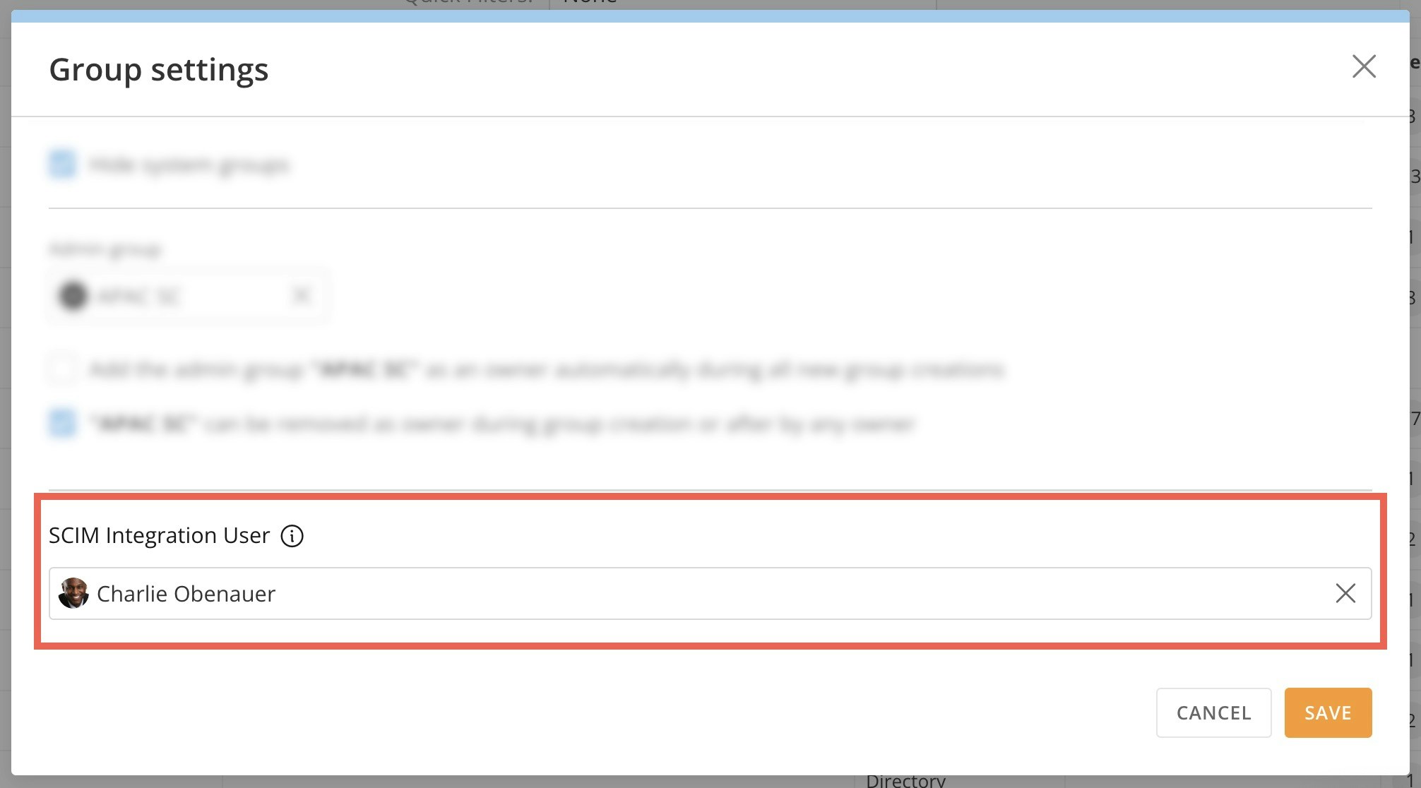 In the modal that displays, use the dropdown to choose the SCIM Integration User and save your changes.