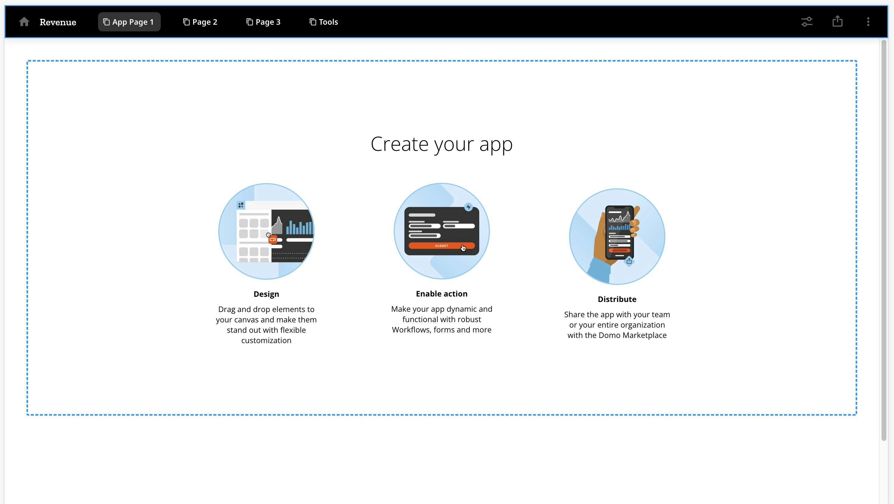 ![]() | Distribute | Allows you to share the app with users and groups within Domo; you can also enter an email address to invite a new user. You can compose a message and send an email notification of the shared app. Also allows you to embed the app with Domo Everywhere. See Embed an App below. |