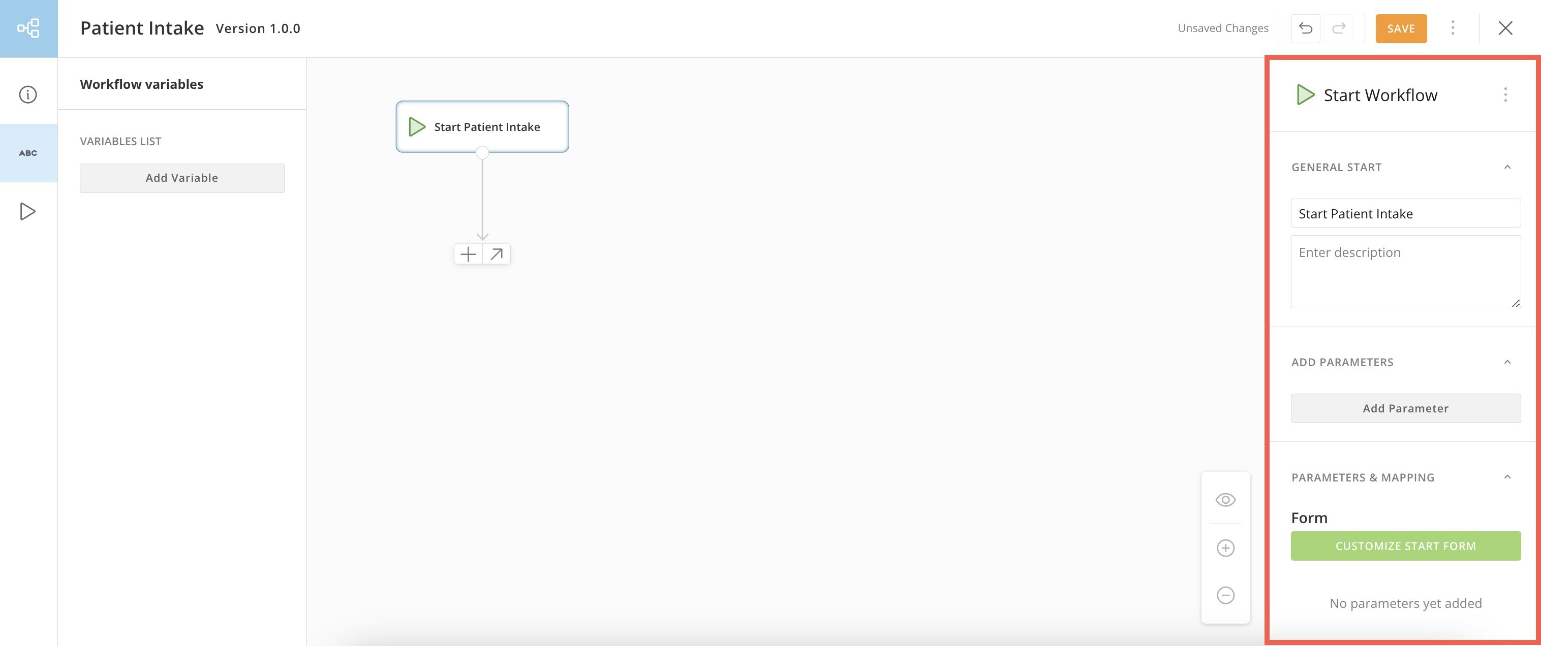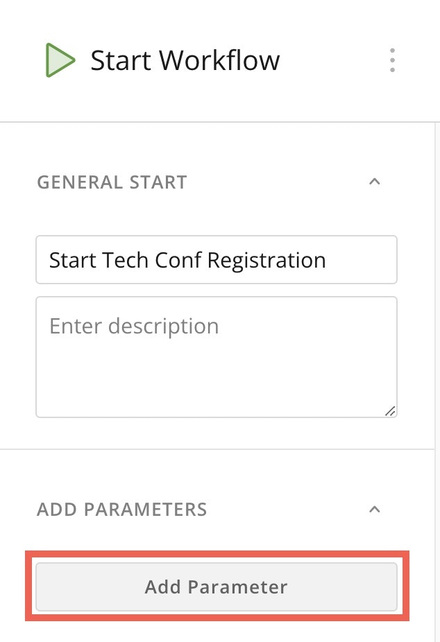 Parameters require or allow data values to be passed into the workflow when it executes. Follow these steps to add and configure your starting parameters:-