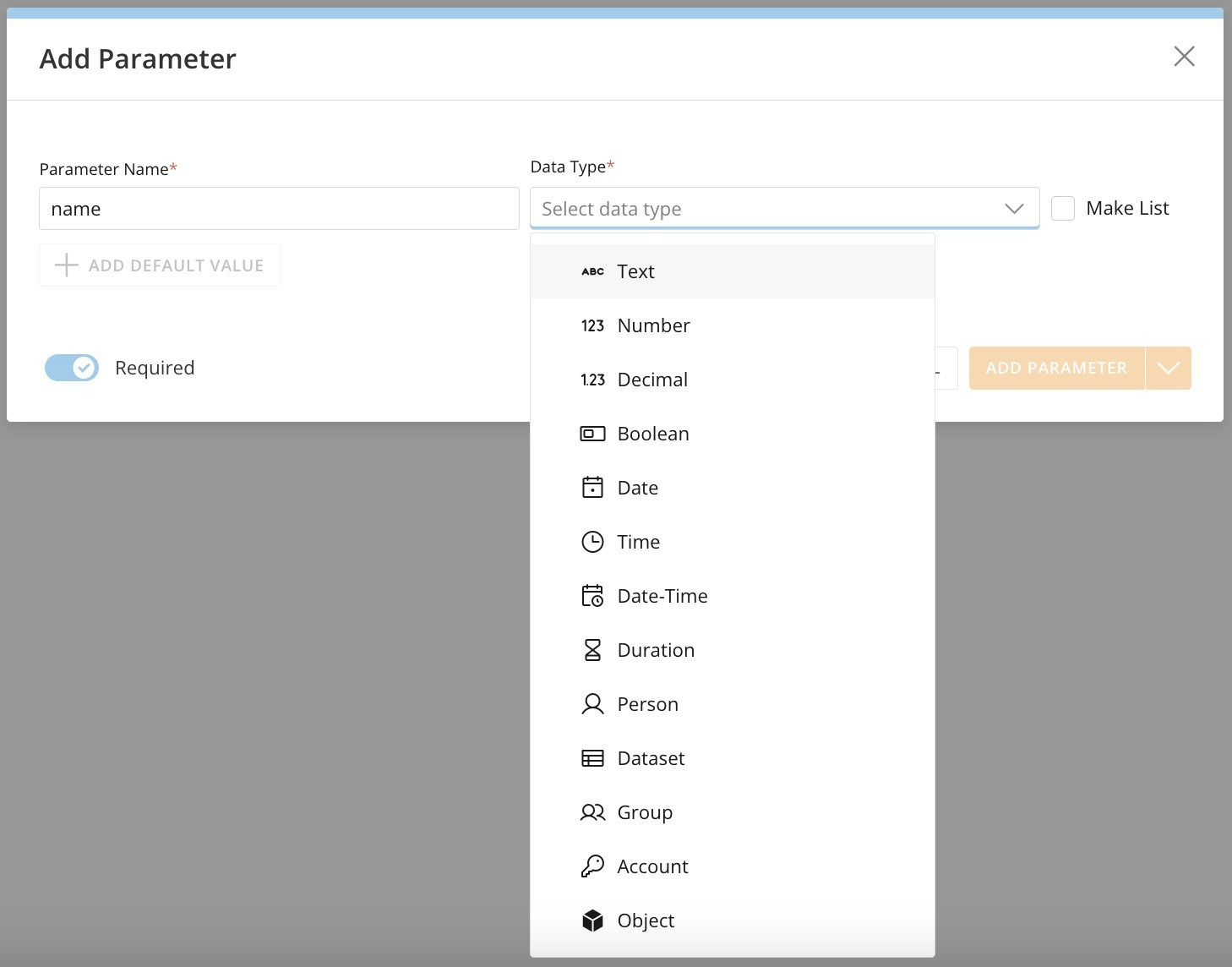 Choose a data type for the parameter. Learn about the available data types.