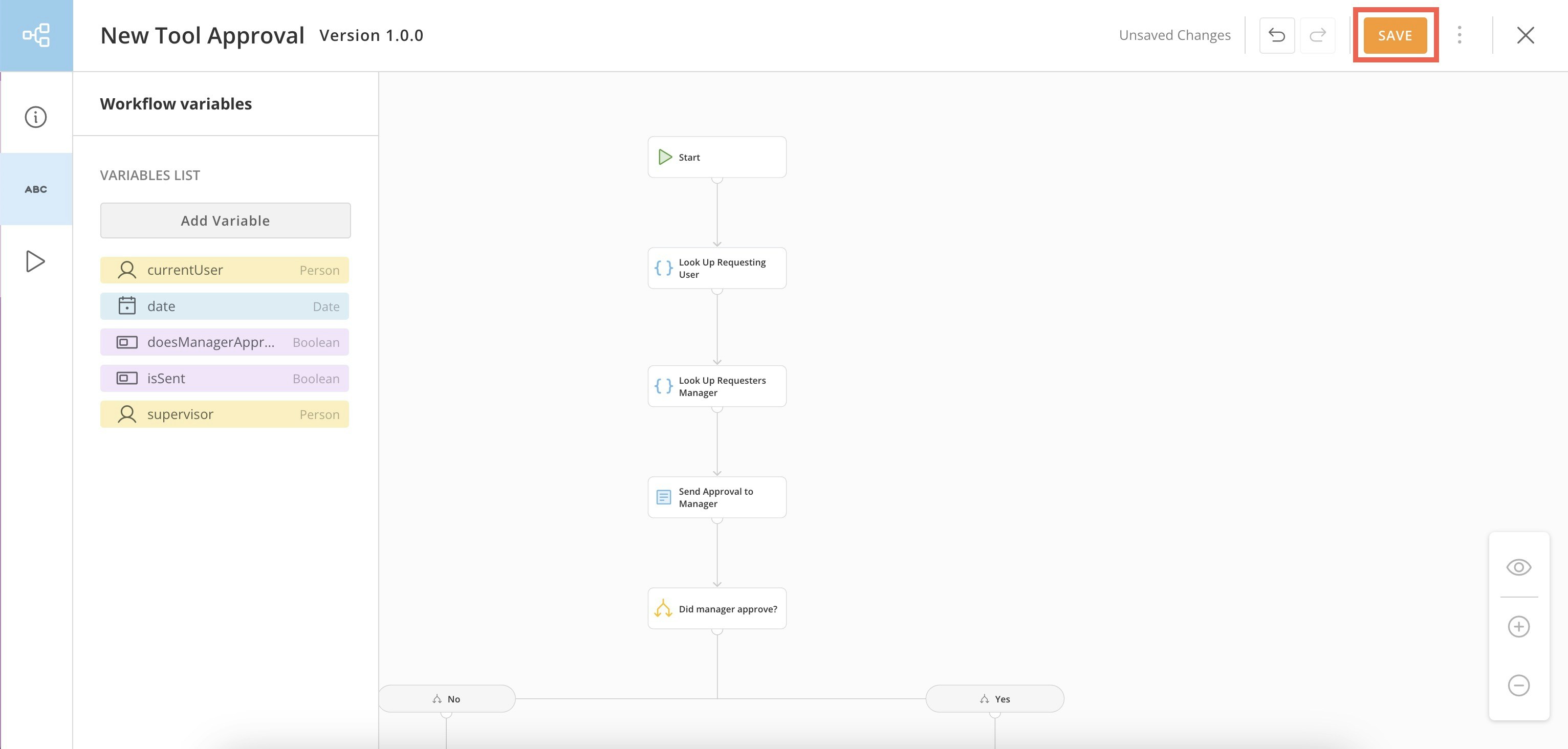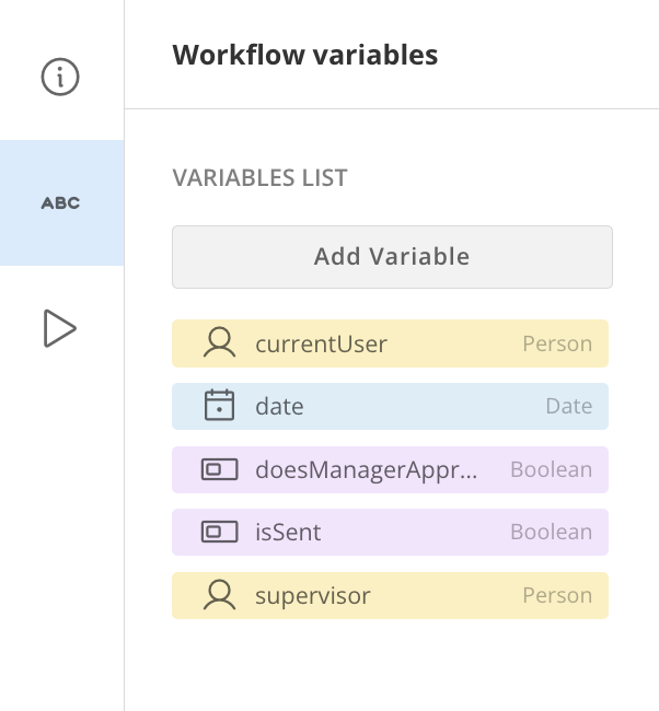 - Go to the Workflow variables tab in the canvas left navigation.