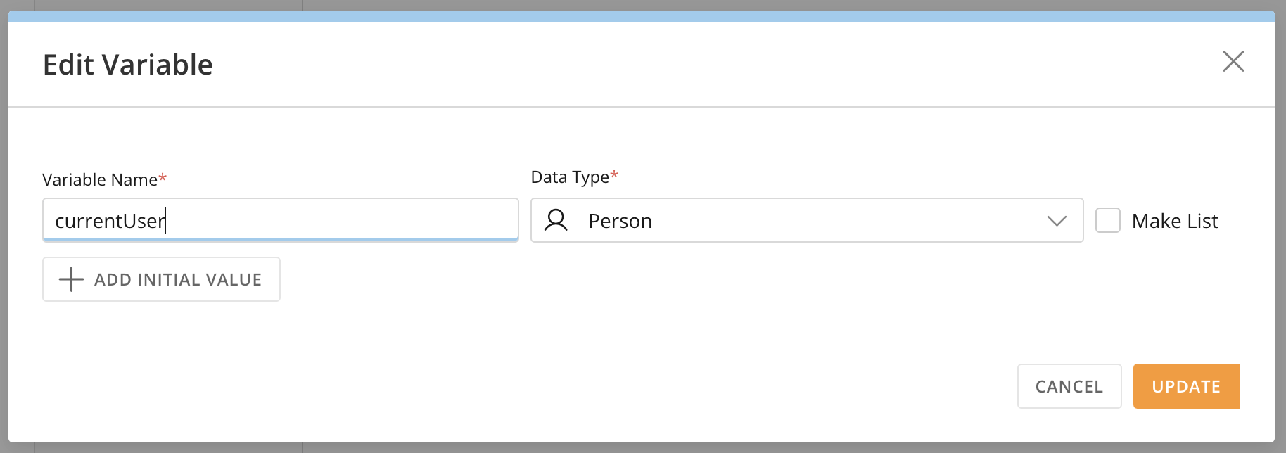 (Optional) If you want this variable to always have a certain value when the workflow executes, select + Add Initial Value.
