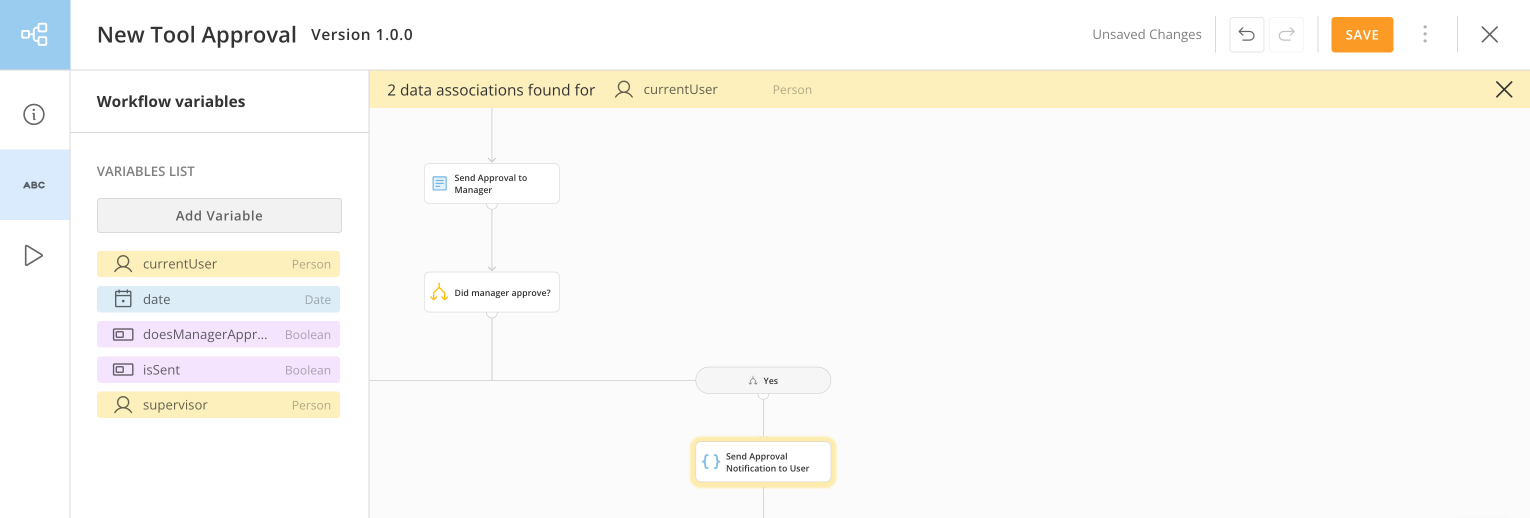The data association tool allows you to see where variables are in your workflow. In the Workflow variables tab of the left navigation, select a variable in the variables list. The shapes in the workflow that reference that variable are highlighted in the variable’s color and a correspondingly colored banner displays at the top of the canvas. In the example below, the Send Approval Notification to User code function references thecurrentUser variable; both the function and the banner are colored yellow because currentUser has a Person data type.
