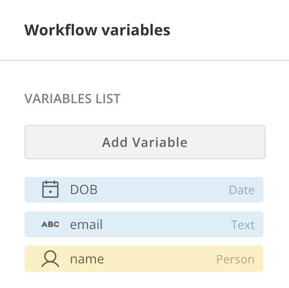 Workflow variables tab, you can add and view variables color-coded by data type. Learn how to add a variable and use the data association tool below.