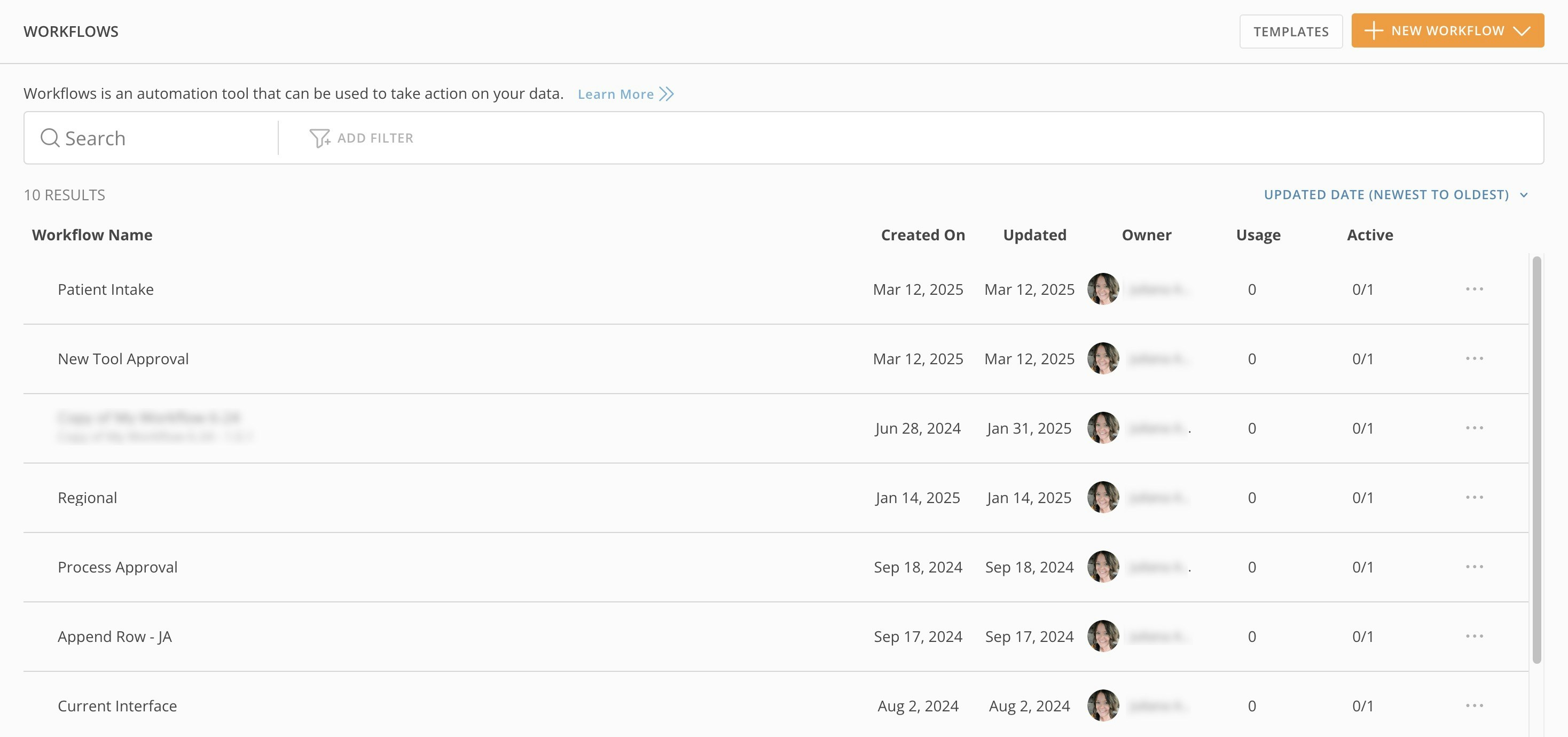 If you have access to at least one workflow (including those you’ve created), the default view lists all your available workflows. |