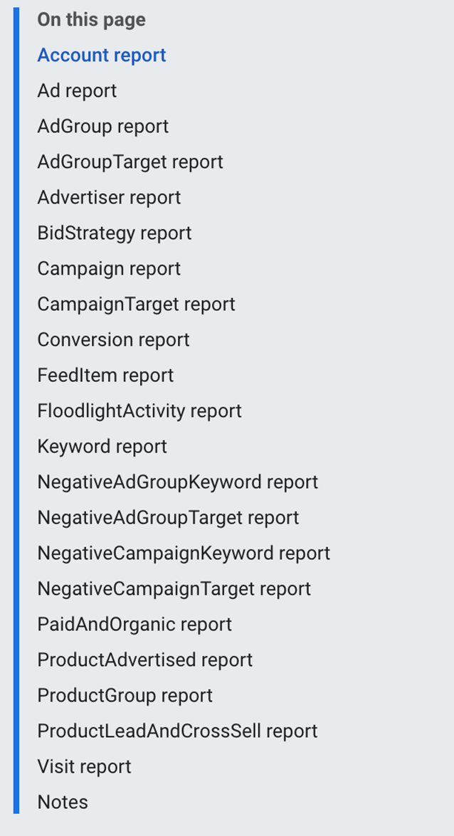 - Search for the legacy API report name. On the right-hand side of the page, you will see a list of reports available in the legacy API, as shown below.