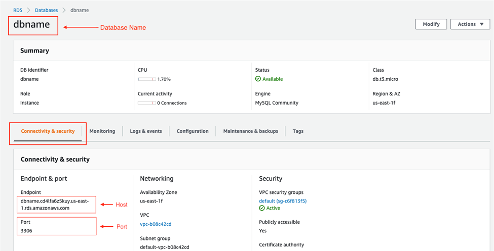 Connectivity & security tab, copy the value titled ‘endpoint’ (THIS IS THE HOST).
