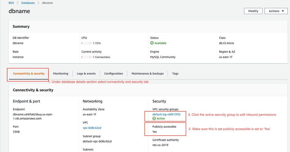 - If publicly accessible is No, click modify on the top right and change the publicly accessible settings under Connectivity, extend the Additional configuration section, and then choose Publicly accessible, Yes.).