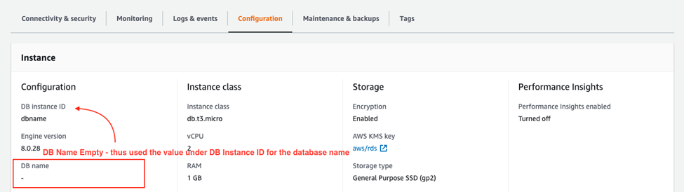 configuration tab on the database setting screen and take note of the value in DB Name. If DB Name is empty, use the value under DB Instance ID.