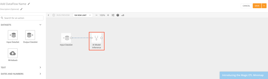 The Magic ETL canvas opens with an AI Model Inference tile deployed. Learn more about the AI Model Inference tile.