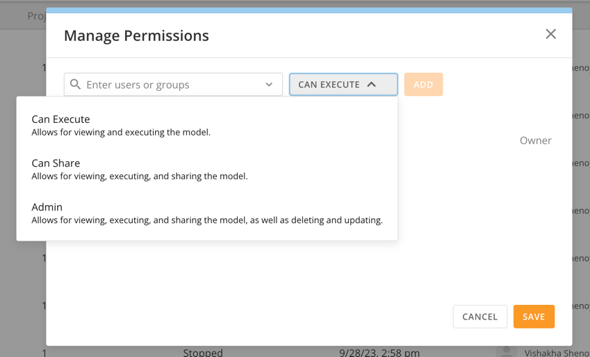 - Can Execute — Grants access to view and execute the model.
