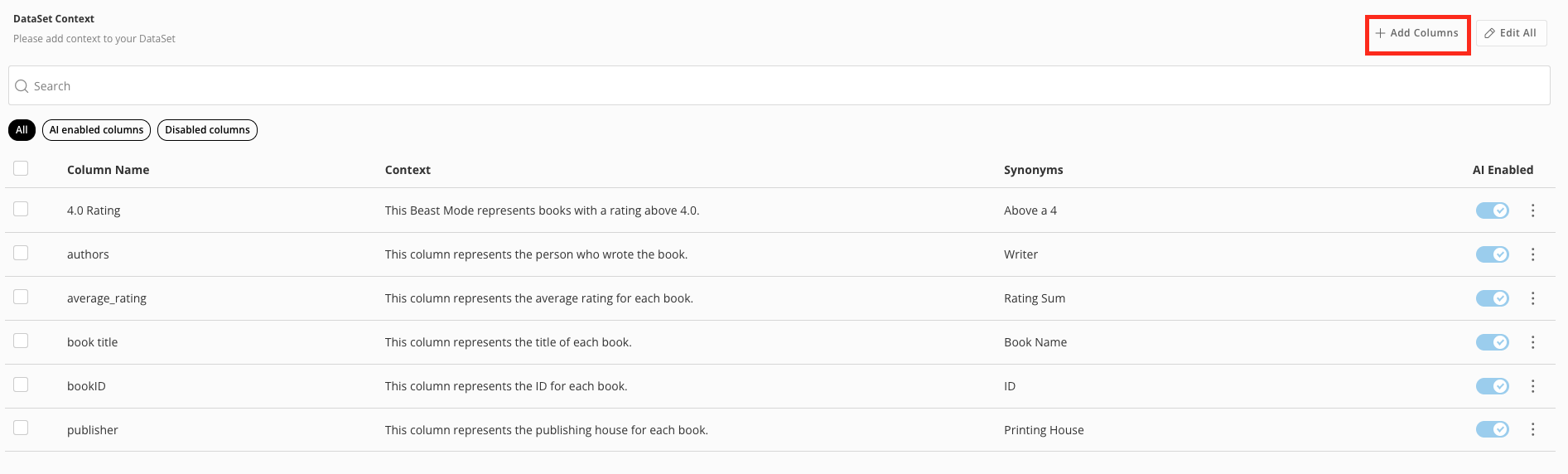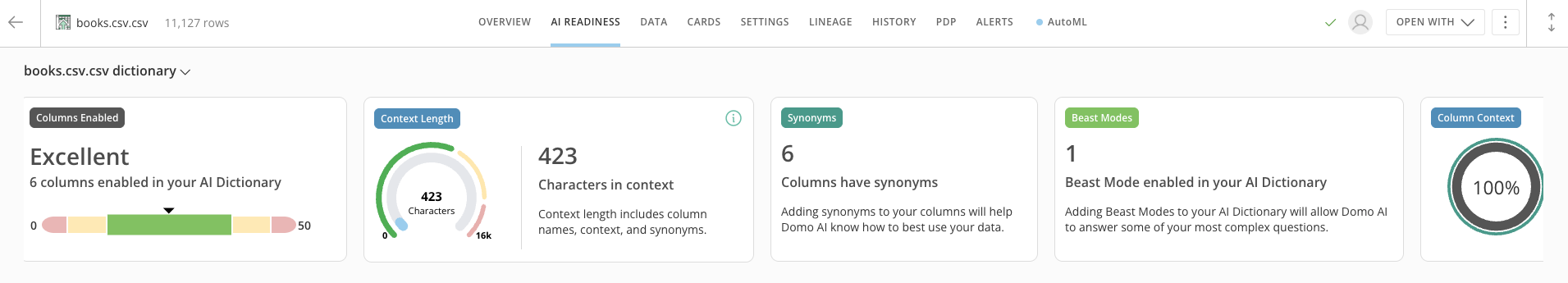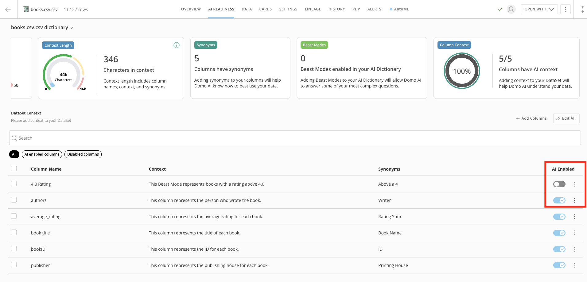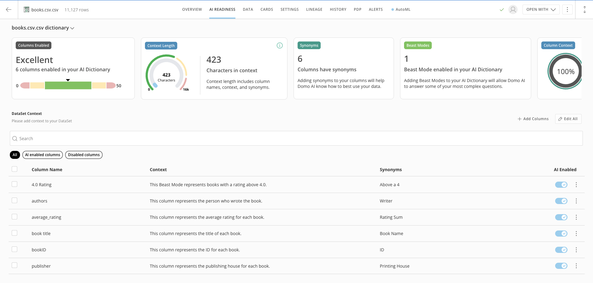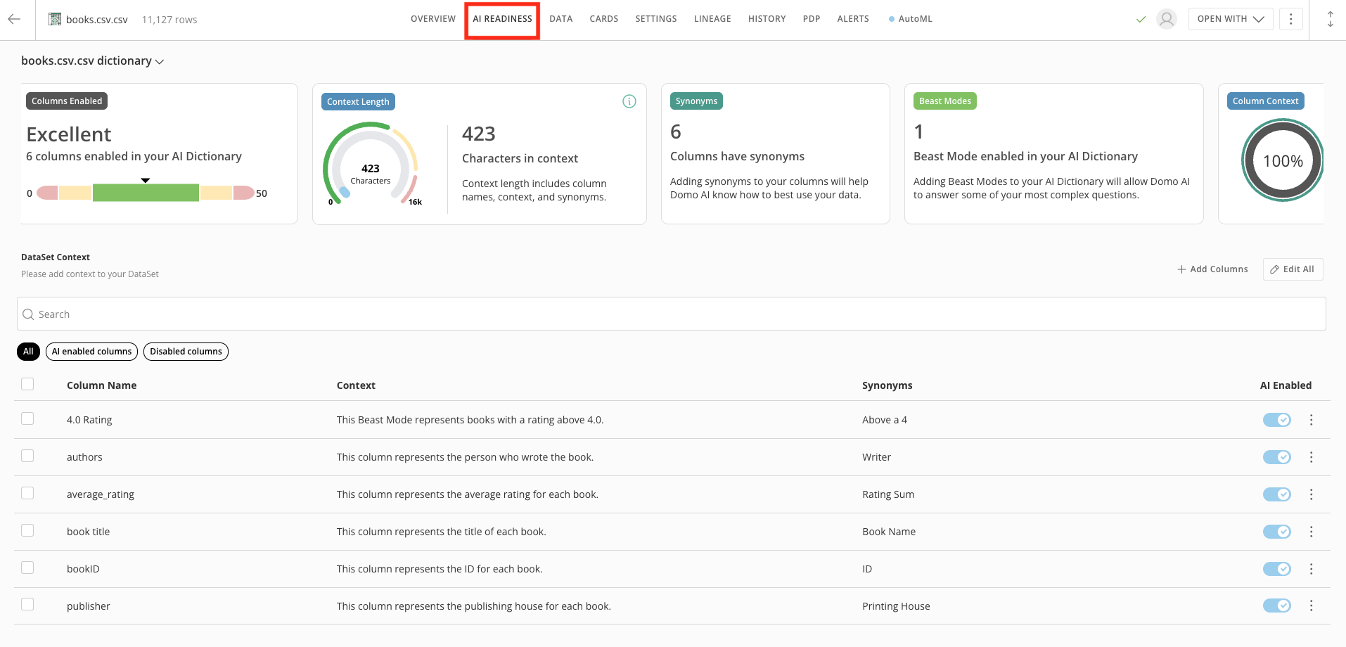 In the AI Readiness tab, you can see various metrics that visualize your DataSet’s AI readiness. You can also add DataSet Context, add synonyms and context, and enable AI for each column.Note: If you don’t enable a column for AI using the AI Enabled toggle, the AI does not use that column.