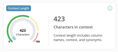 - Context Length — The number of characters in your readiness configuration. This count includes column names, DataSet context, and synonyms. Adding context to your DataSet helps improve its reliability, but adding too much context can decrease overall reliability. The radial gauge chart displays your context length.