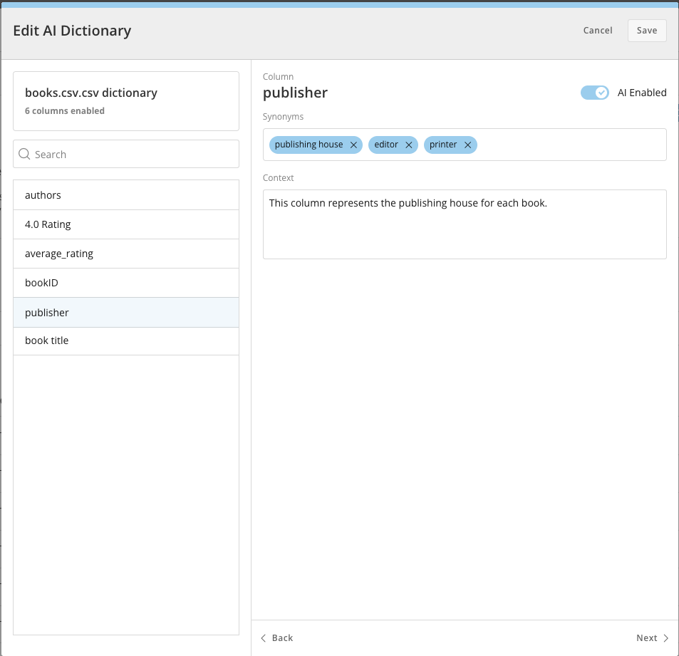 If you were to ask AI Chat about the publishing house a specific book was published through, the synonyms would help it know to look at the publisher column in your DataSet.