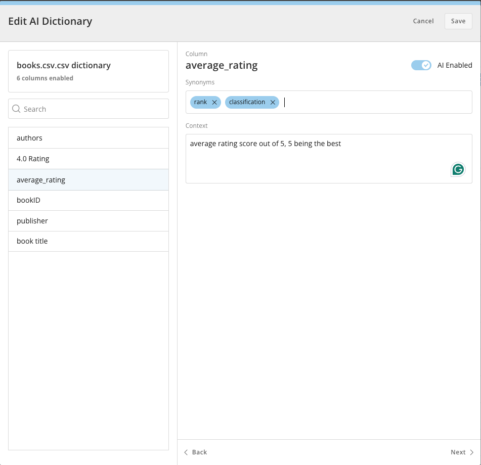 average\_ratinglabel could also be identified as ‘rank’ or ‘classification.’ Learn more. - Context — This is where you can add more in-depth information about your data columns. For example, a column with the