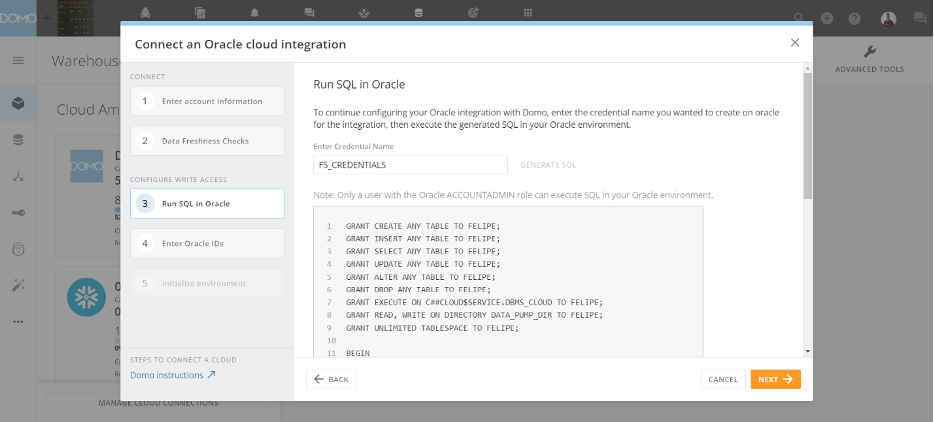- In the next step, confirm that you understand that Domo can make changes to your Oracle environment and select Next. A message confirming that your write integration was successfully configured displays.