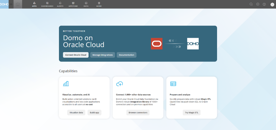 You can connect your data from Oracle Cloud to Domo using Cloud Amplifier native integrations. Provide connection parameters and select the tables you want to see as Domo DataSets. Follow the steps in this article to configure your Oracle-Domo read and write connections with Cloud Amplifier.Architectural Overview
