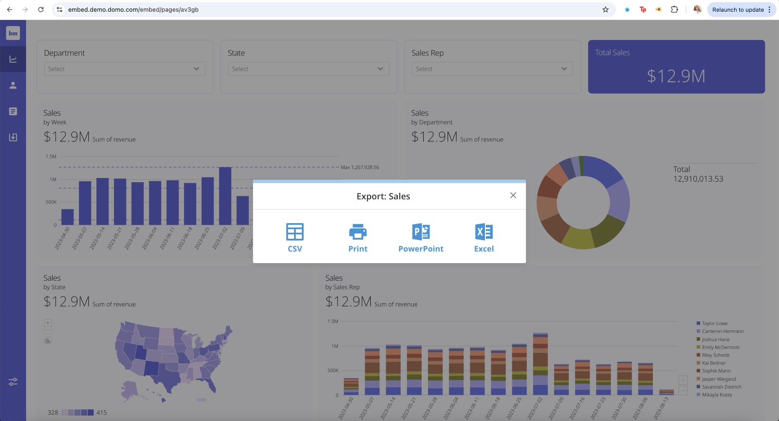 Card exports are available with App Studio Embed. This feature allows you to export your cards in Embed as a CSV, PDF, PowerPoint, or Excel sheet.