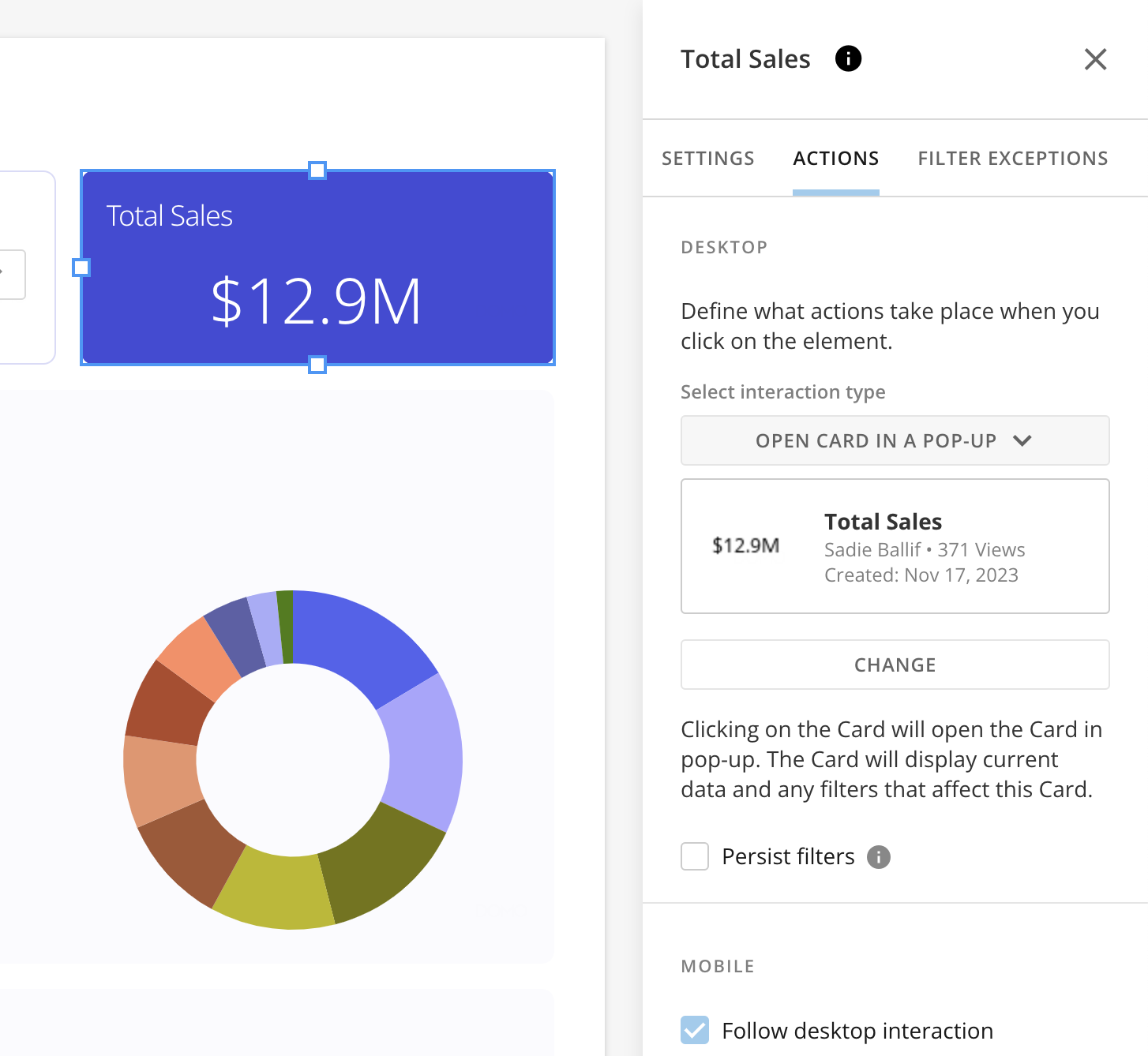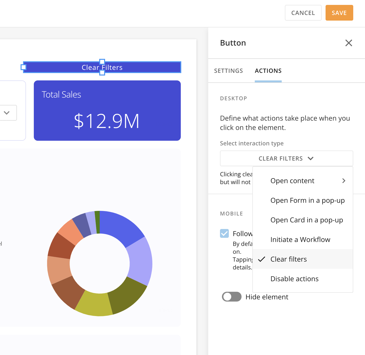 The Clear Filters action is now available in App Studio. This action allows you to clear all page filters with a single click, eliminating the need to go to the control panel.