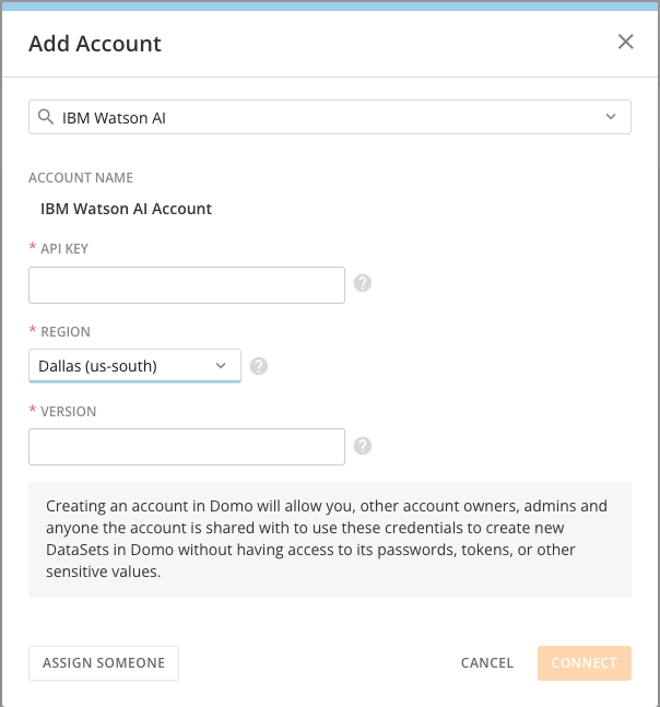 - Fill out the information required for the IBM Watson AI Account. This connection requires an API key, region, and version.
