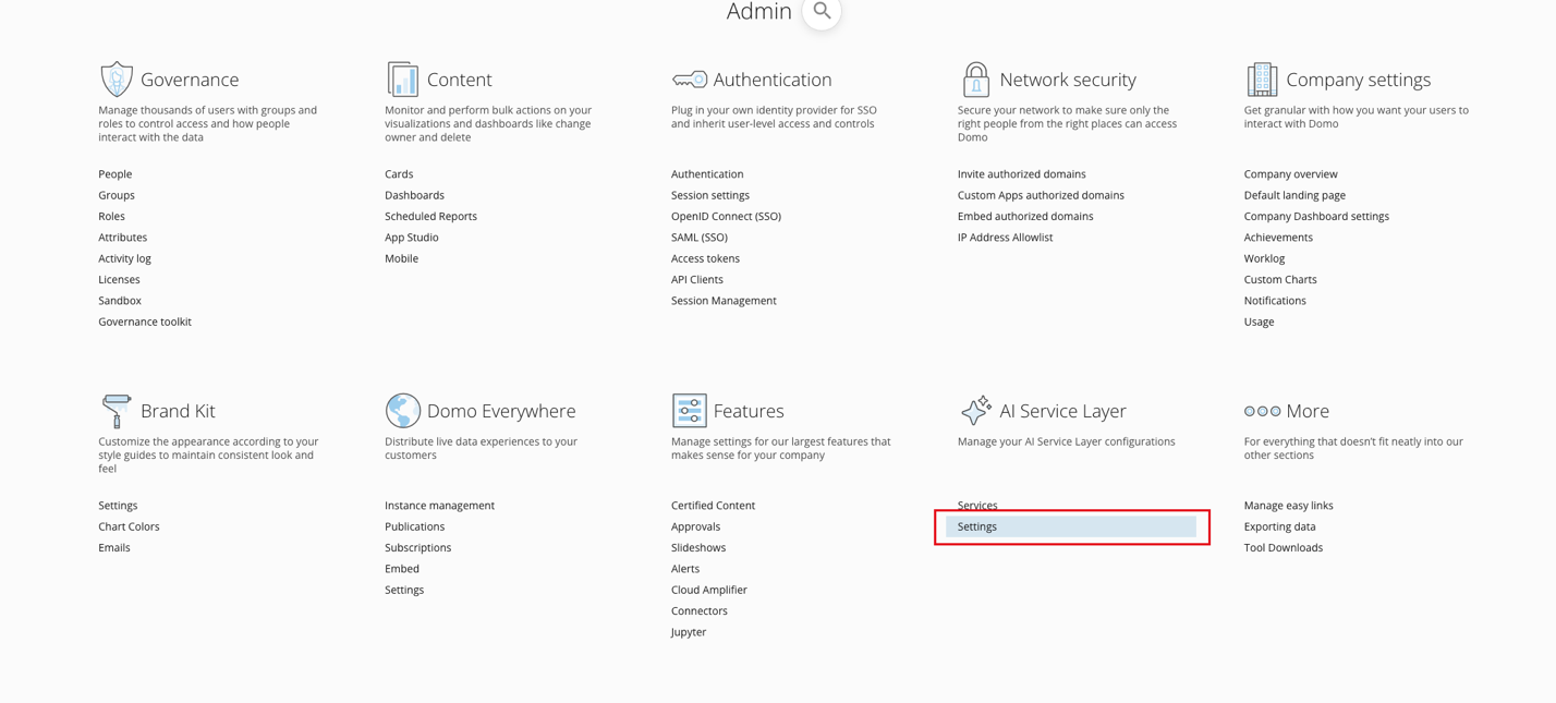 In the Domo navigation, select More > Admin. In the Admin Settings under AI Service Layer, choose Settings.