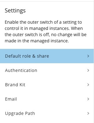 Instance template settings allow you to configure elements like content sharing and authentication. Each setting includes one or more toggles. For some settings, you must determine a value or range of values.