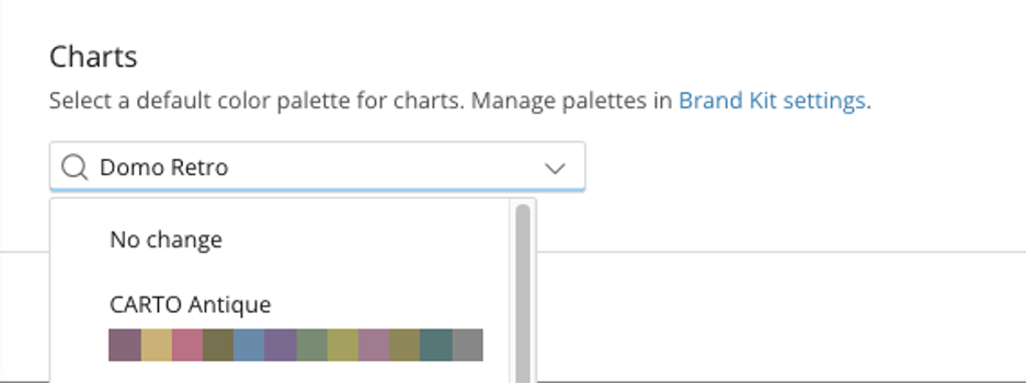 - Charts — Use the dropdown to choose a default color palette for charts. Learn how to manage palettes and chart colors.