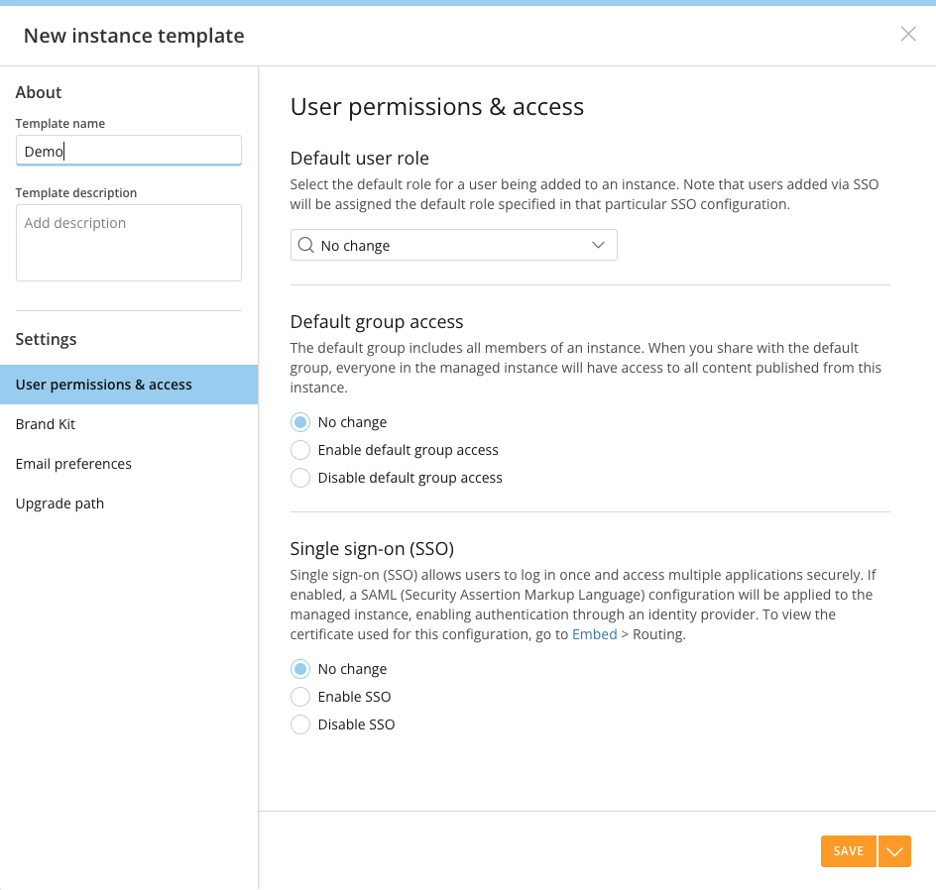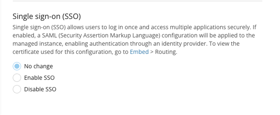 In the User permissions & access section, Single sign-on (SSO) allows you to control whether the managed instance uses SAML for single sign-on (SSO) authentication. Select Disable SSO to turn off SSO and remove any SAML configurations in the managed instance.