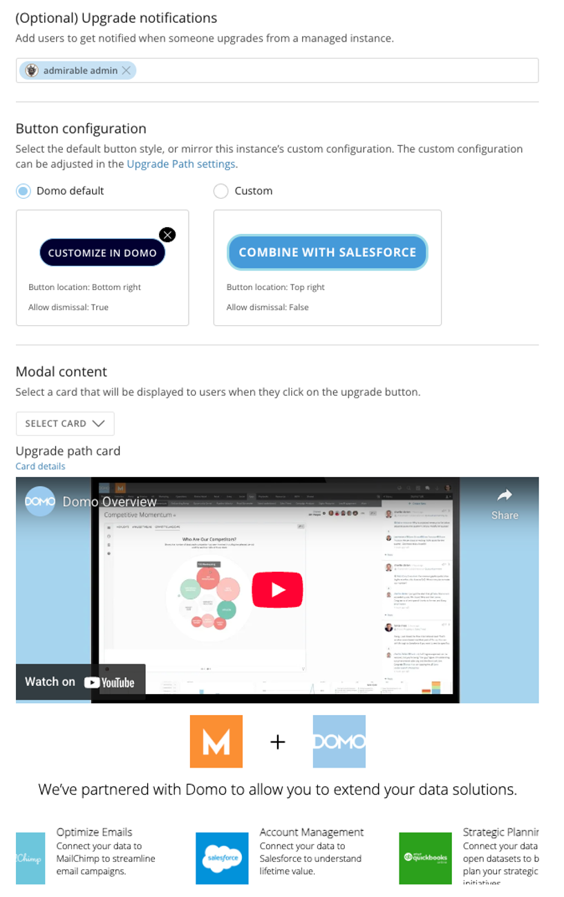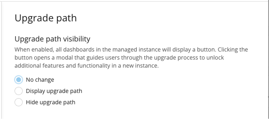 The Upgrade path section allows you to configure an upgrade path for your instance.What is the upgrade path?The upgrade path allows your customers to opt in to more of Domo’s features. Learn more.