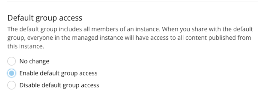 In the User permissions & access section, Default group access allows you to control the managed instance’s auto-subscription to your publications. If you select the Enable default group access button, everyone in the managed instance’s default group can access all content published from the instance. If you select the Disable default group access button, previously shared content remains shared, but future publications do not automatically share with the default group.What is the default group?The default group contains all individuals in the instance.