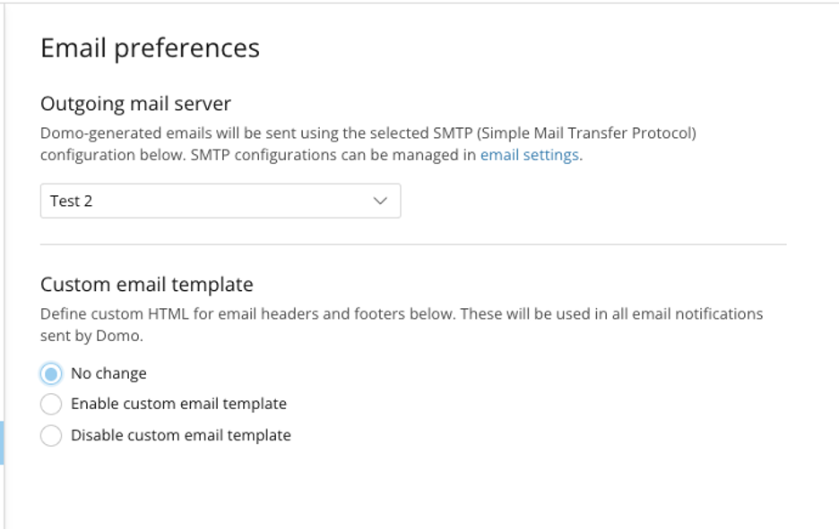 - Outgoing mail server allows you to select an SMTP configuration for Domo-generated emails. Use the dropdown to select a configured SMTP server if you have configured one. Learn more about configuring an SMTP server.