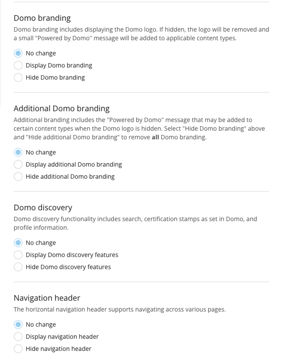 - Domo discovery — You can control whether users in the managed instance can find specific uses in Domo, such as Search, Profile, Approval, and Certifications.