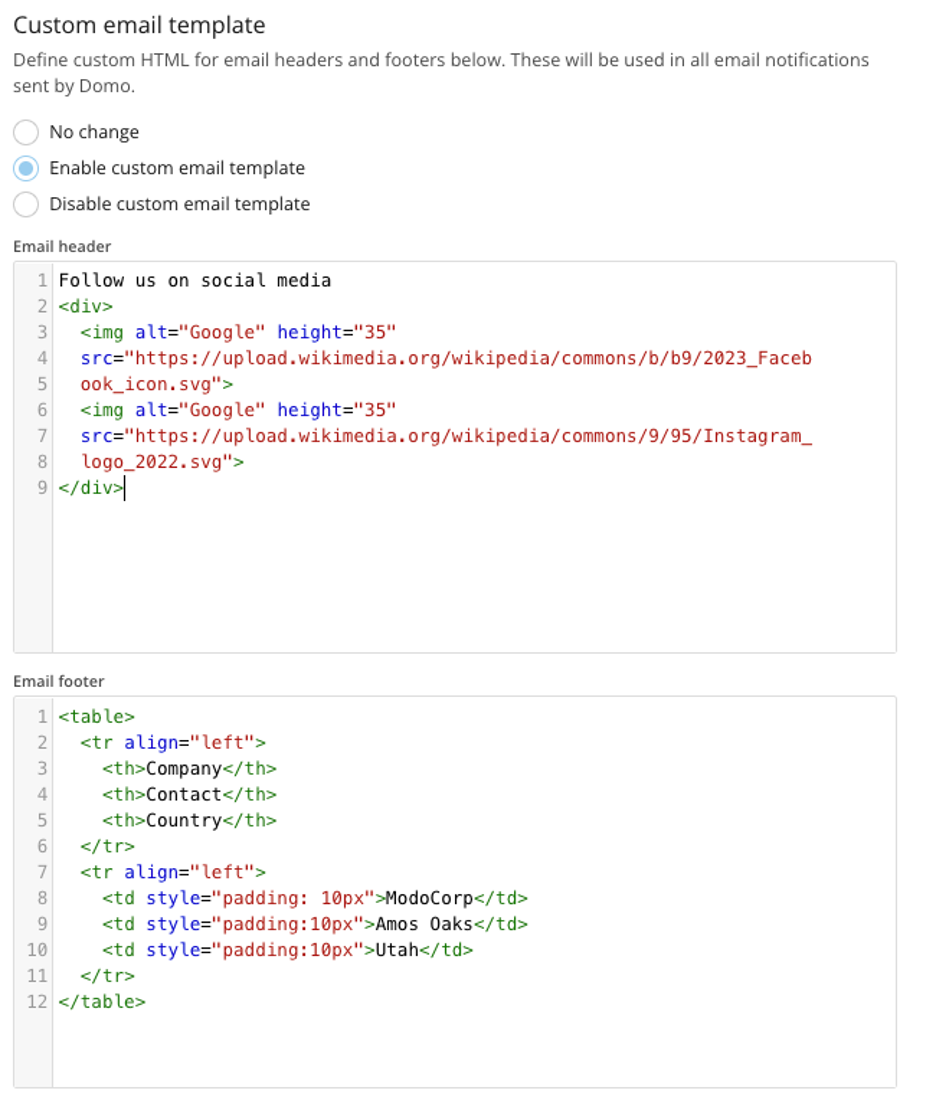 - Override any configured header and footer in the managed instance with the contents of Email header and Email footer in the template.
