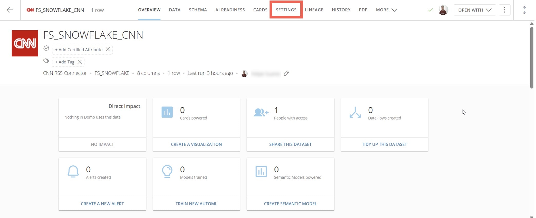 Locate the DataSet and select it to view its Details. Go to the Settings tab.