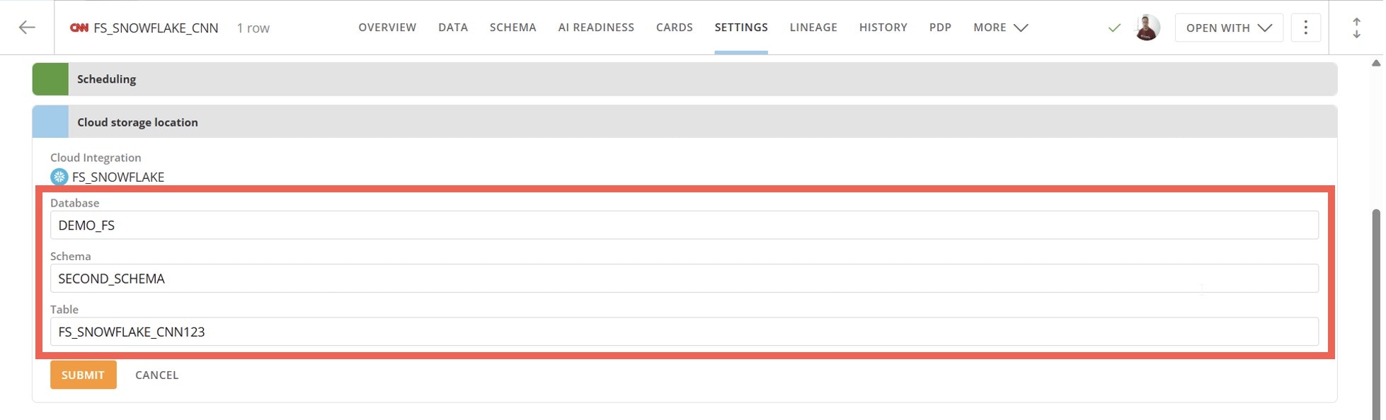 - To relocate a table, change the Database and Schema and select Submit.