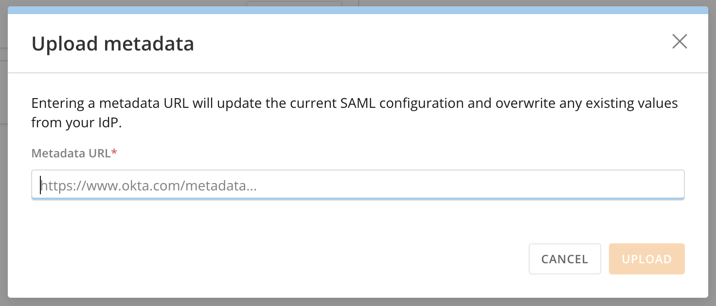 In the modal that appears, enter the metadata URL from your IdP and select Upload.